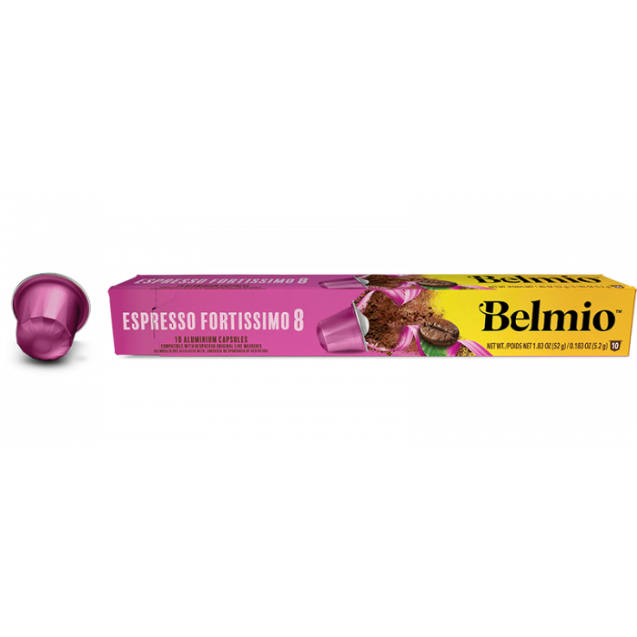 Belmio Espresso Fortissimo kapsler er kompatible med Nespresso® maskiner og er kendt for deres intense og modige smag.