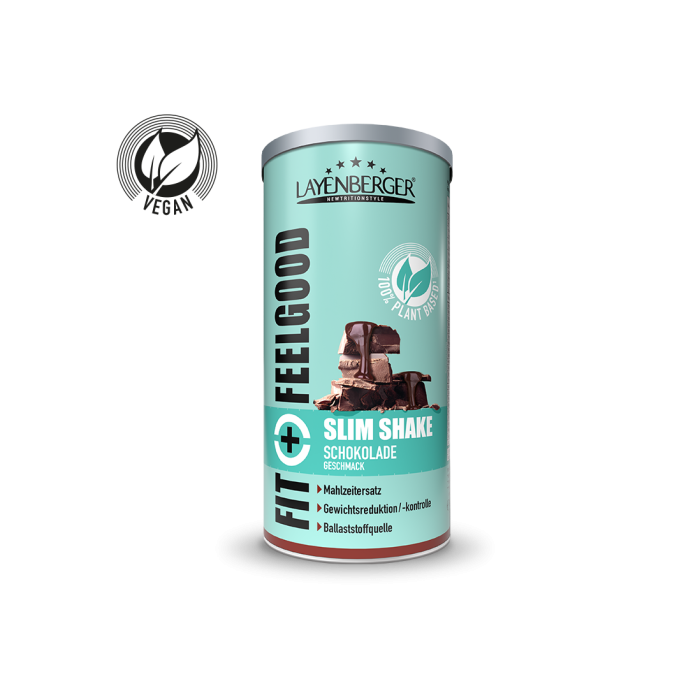 With our Layenberger Fit + Feelgood Slim Shake Plant Based Chocolate it is easy to replace one or two of the three daily meals. Simply prepare 33g powder with 300ml unsweetened soy drink in a shaker - and ready is your delicious meal with only 204kcal. Our vegan Fit + Feelgood products are a complete meal replacement and provide you with a balanced and reliable supply of everything your body needs. As a source of fibre, one portion also ensures a long-lasting saturation. On the way to your weight goal, please make sure to drink enough - at least two liters of calorie-free or low-calorie liquid per day!